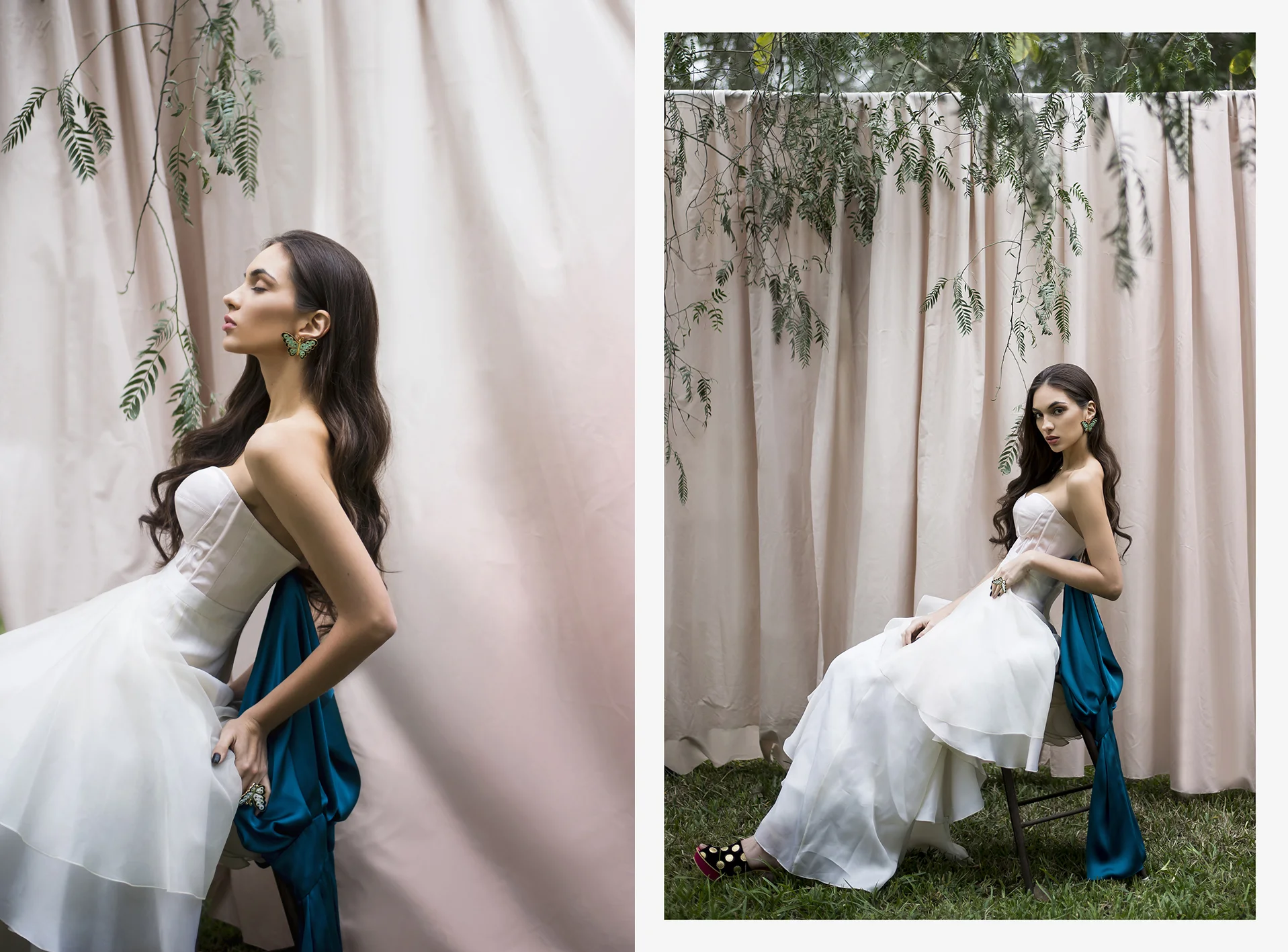 Falda y corset, CAROLINA TOLA. Aretes y anillo mariposa, JESSICA BUTRICH.